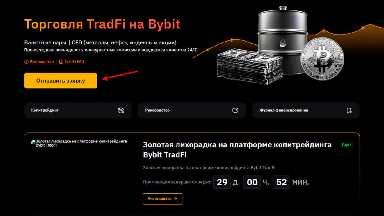 Затем, после входа в свой аккаунт перейдите в раздел «Торговать», расположенный в нижней части экрана и найдите там вкладку “TradFi”. Далее, нужно создать специальный суб-аккаунт TradFi: для этого нажмите кнопку “Отправить заявку” и внимательно ознакомьтесь с условиями предоставления услуги, после чего примите их.