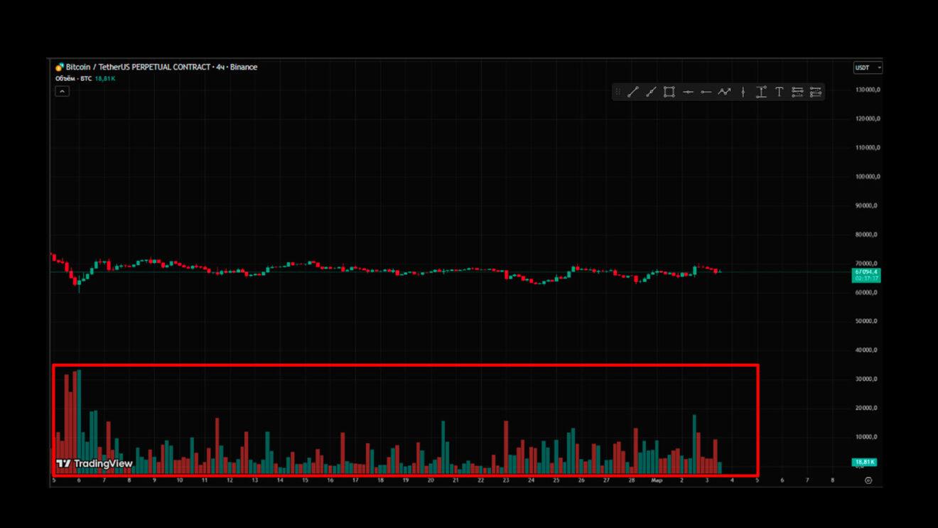 Рис. 2: Индикатор объема на 4-х часовом графике BTC.