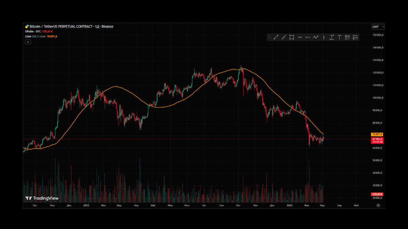 Рис.1: Скользящая средняя (оранжевая линия) с периодом 200 на дневном графике BTC.